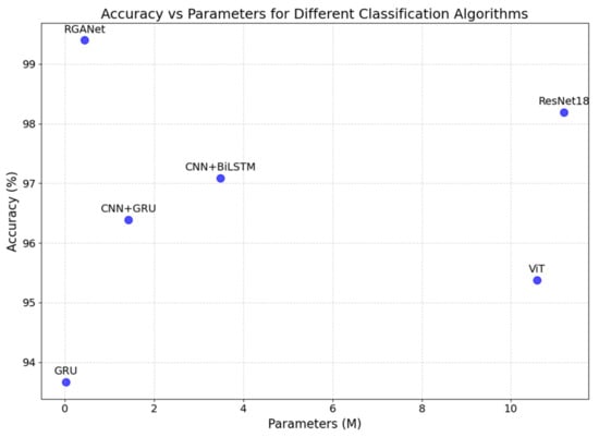 Figure 10 illustrates the performance differences among various models, particularly in terms of the balance between accuracy and model complexity. It can be seen that our model achieves the highest accuracy with a relatively small number of parameters, making it well-suited for use on devices with limited computational resources.