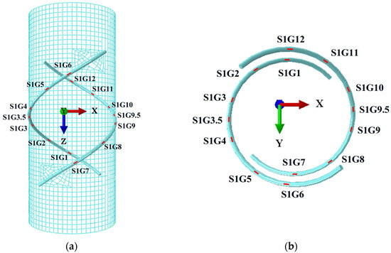 A composed sensor system is simulated using FRP tubes and double-helix steel wires. The double-helix steel wire is divided into 14 units (S1G1, S1G2, S1G3, S1G3.5, S1G4, S1G5, S1G6, S1G7, S1G8, S1G9, S1G9.5, S1G10, S1G11, S1G12), which are represented as 14 strain gauges affixed to the FRP tube. The measurement points are arranged symmetrically. When one end of the steel tube, RP-2, is subjected to force, the sensor system undergoes elastic deformation, and the 14 cells generate corresponding strain values. The other end, RP-1, generates corresponding reaction forces (P, Vx, Vy, Mx, My). The distribution of the 14 cells is illustrated in Figure 2.