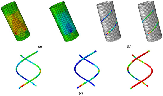 Typical results of FEM analysis: (a) equivalent stresses of FRP tube; (b) strain distribution of double-helix sensor; (c) strain patterns of fiber sensor wires.