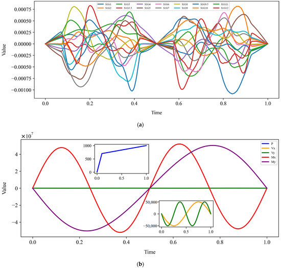 Plot of time vs. strain and branch reaction force: (a) time vs. 14 strains; (b) time vs. 5 reaction forces.