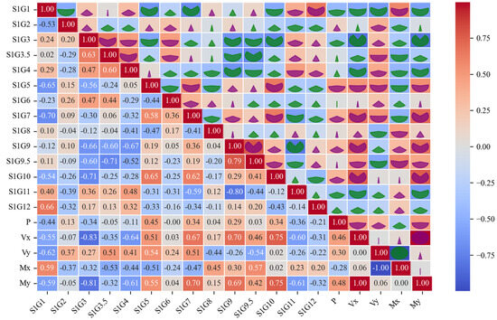 The relationships between the input and output variables are elucidated through the use of a correlation matrix heatmap (Heatmap), as illustrated in Figure 5. The values of the correlation coefficients are represented by shades of color, typically employing distinct color mappings [37,38,39]. For example, S1G1 exhibits a notable negative correlation with My, Vx, Vy, and P, while showing a positive correlation with Mx, making it an important input variable. S1G7 is a key variable, displaying a strong positive correlation with My and a significant negative correlation with Mx. S1G9.5 has a significant negative correlation with Vy, making it a critical variable for representing Vy in the model.