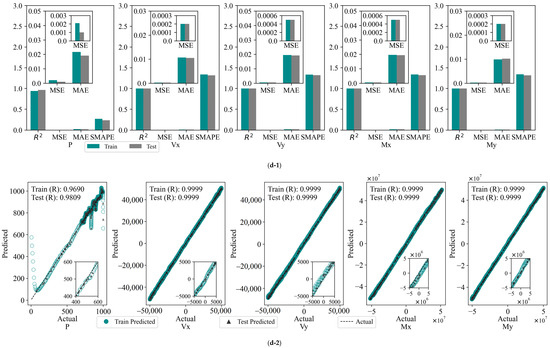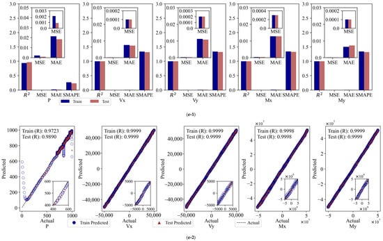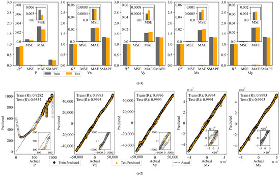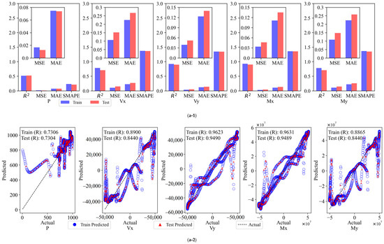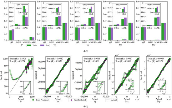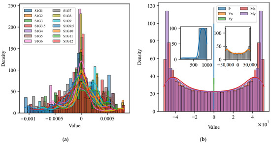 Furthermore, Figure 6 depicts the histograms and probability density plots of the input and output variables [42,43,44]. The distributions of the majority of input variables in subfigure (a) exhibit pronounced bimodal characteristics and substantial fluctuations around 0. The data exhibit bimodal characteristics, with kurtosis concentrated around 0. In contrast, subfigure (b) illustrates that the distribution of output variables is symmetrical, particularly in the Vx, Vy, Mx, and My variables, which display the characteristics of a U-shaped distribution, while the distribution of P variables is more concentrated. Overall, the distributional characteristics of the input and output variables demonstrate disparate numerical properties, with the input variables exhibiting a more intricate pattern and the output variables displaying a more concentrated distribution. This discrepancy in distribution patterns suggests a potential correlation between the data sets pertaining to the input strains and the output reaction force variables.