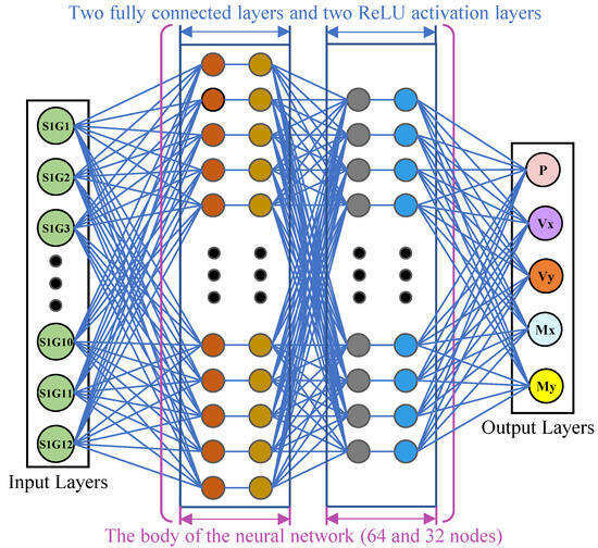 The FCNN model presented in this paper comprises an input layer, two hidden layers, and an output layer. The input layer is responsible for accepting the input data, the first hidden layer contains 64 nodes, and the second hidden layer contains 32 nodes. The final layer of the network is responsible for the output, which is represented by five variables: P, Vx, Vy, Mx, and My. The FCNN model was trained for 100 training cycles with a batch size of 32, and the learning rate was set to 0.01. The schematic diagram of the AI neural network multiple regression modeling engine is presented in Figure 7.