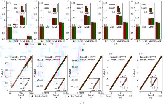 The numerical statistical characterization of the input and output variables is illustrated in Table 3 [40,41]. The numerical ranges of the input strains are small, with the maximum and minimum values fluctuating on the order of 10−4, with the mean close to zero and a small standard deviation, reflecting a small range of fluctuation; in contrast, the numerical ranges of the output reaction force variables are significantly larger, with the maximum and minimum values on the order of 103 to 107, respectively, especially for Mx and My, which exhibit a high degree of dispersion in their data distributions. The analysis of skewness and kurtosis revealed that some of the variables (e.g., S1G8, S1G2, etc.) were characterized by skewed distributions, with most of the kurtosis values being low and close to the normal distribution, whereas the kurtoses of P and Vy were high and the skewness was low, displaying a slight negative skewness, suggesting that the distributions of these variables had a tendency to be concentrated. Overall, the statistical analysis provides the basis for subsequent model construction and variable screening, revealing significant differences in the values and distributional characteristics of the input and output variables.
