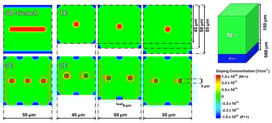 This study aimed to evaluate, through simulation, alternative 3D electrode geometries based on columns instead of trench-electrodes as a substitute for the 3D trench design. The proposed geometries, summarized in Table 1 and sketched in Figure 1, include configurations with one electrode (1E), two electrodes (2E), and three electrodes (3E). Each geometry is examined with pixel pitches of 45 µm, 50 µm, and 55 µm. The performance of these designs is compared with the TimeSPOT 3D trench pixel, which is already characterised over all possible aspects, ranging from simulation to beam test data.