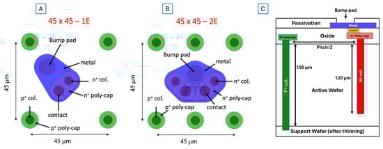Layout of 3D column pixels with 45 µm pitch: (A) 1E, (B) 2E, and (C) cross section showing column structure (not to scale).