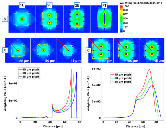 (A) Weighting field for all designed geometries at a 55 µm pitch. Pictures to scale. The yellow line shows the perimeter of the pixel under simulation. (B,C) show the weighting field behaviour for the 1E and 2E designs, respectively, at different pixel sizes. The red line indicates the probeline used to analyse the weighting field amplitude from the centre towards the outside, compared at the respective plot on the right.