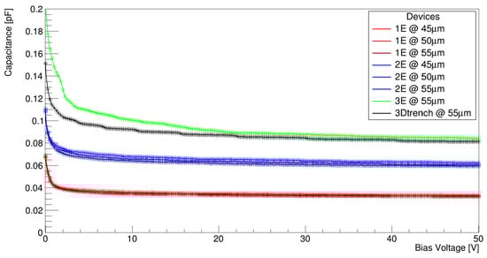 The total capacitance of the pixel consists of two main contributions: one from the bulk, depending on the pixel geometry and size, and another one from the surface, depending on the details of the different layers involved (e.g., p-spray, oxide, poly-silicon, metallization, etc.). While the bulk contribution to the capacitance can vary significantly between devices, the surface contribution is nearly identical across them and typically adds an additional 10–20 fF to the total capacitance. The bulk capacitance was simulated using the Sentaurus SDevice in a small-signal simulation mode. In Figure 4, it is evident that the smallest capacitance corresponds to the 1E design with a capacitance close to 35 fF. The 2E design exhibits a capacitance approximately twice as large, close to 75 fF, while the 3E geometry slightly surpasses that of the 3D trench. Another observation is that the capacitance of the same geometries shows minimal variation with different pixel sizes, making the number of electrodes the primary factor to consider, excluding sensor thickness. At this phase of the study, the 3E design was excluded from further computational studies, as its increased capacitance, which basically is the same as the 3D trench, does not justify the additional technological and fabrication effort required to produce a similar device with timing performances similar of those of the 3D trench but with a slightly higher capacitance.