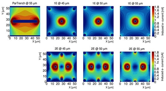 The study of the weighting field was conducted using Synopsys Sentaurus TCAD, applying weighting potentials to the readout electrode according to the Ramo Theorem []. When comparing the 1E, 2E, 3E, and 3D trench geometries, a distinct trend emerges: the 1E design generates a weighting field, which is weaker and extends farther outside its own perimeter compared to all other geometries (Figure 3, relevant to the 55 µm pitch). This finding suggests that the 1E design is more prone to charge-sharing effects in all directions than the 2E, 3E, and 3D trench designs due to their more closed electrode geometry. The 2E design already demonstrates a far better confinement of the weighting field within its active volume, while the TimeSPOT 3D trench offers the best overall performance. Its continuous trenches effectively restrict the weighting field to a single direction associated with the bias line. Comparing weighting fields based on pixel size, the behaviour does not change except for the amplitude, which increases with a smaller pixel pitch.
