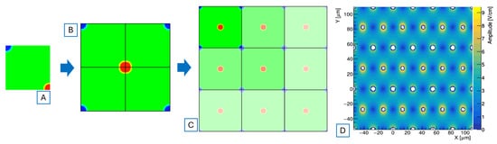 Generation of large pixel structures starting from a single TCAD model. (A) Section of the starting model. (B) Single pixel rebuilt using its symmetry. (C) Replication of a single pixel structure as a 3 × 3 matrix. (D) Electric field map (amplitude) of a 2E, 3 × 3 pixel matrix.
