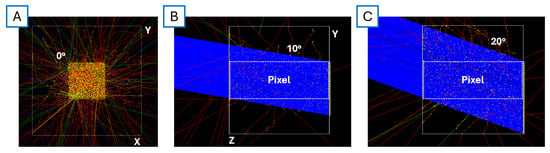 GEANT4 setup developed for the study. (A) Front view of the target when shot with particles at 0°. (B,C) show lateral views of the target with 10° and 20° particles, respectively.