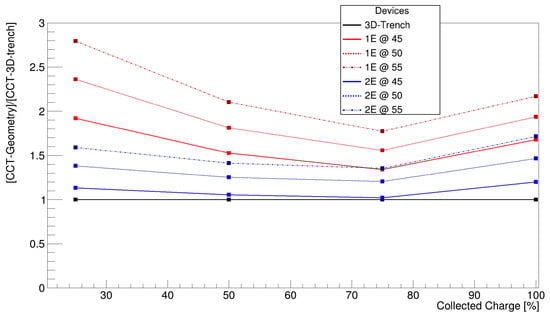 For this study, the CCT was evaluated at various thresholds, which are 25%, 50%, 75%, and 100%, to display how efficiently the sensor collects the majority of the charge. A threshold in charge at 1000 electron–hole pairs was applied as the minimum amount of charge detectable from a potential readout ASIC. Figure 8 shows the average trend observed among all geometries with respect to the TimeSPOT 3D trench sensor.