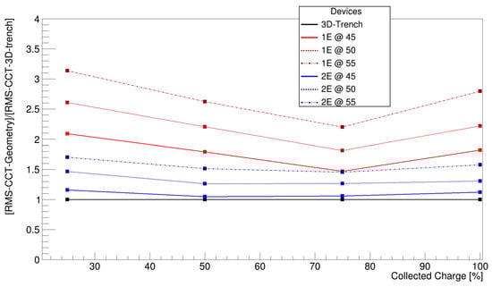 Relative root mean square of the charge collection time distributions of 1E and 2E geometries compared to 3D trench.