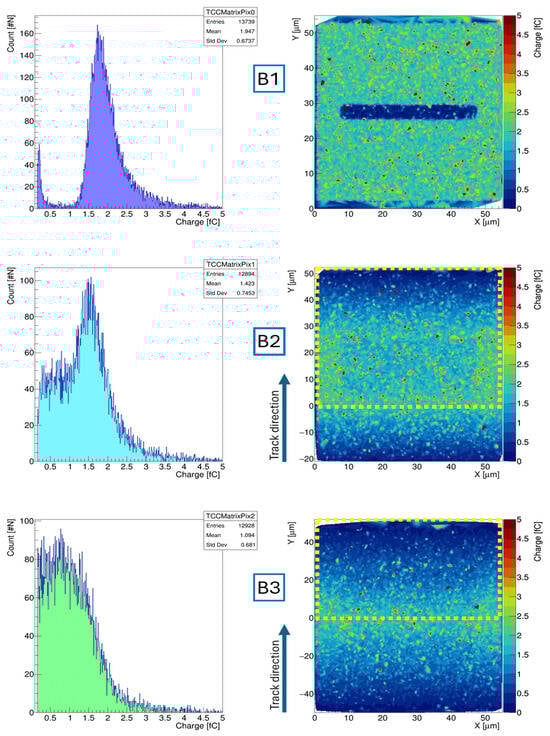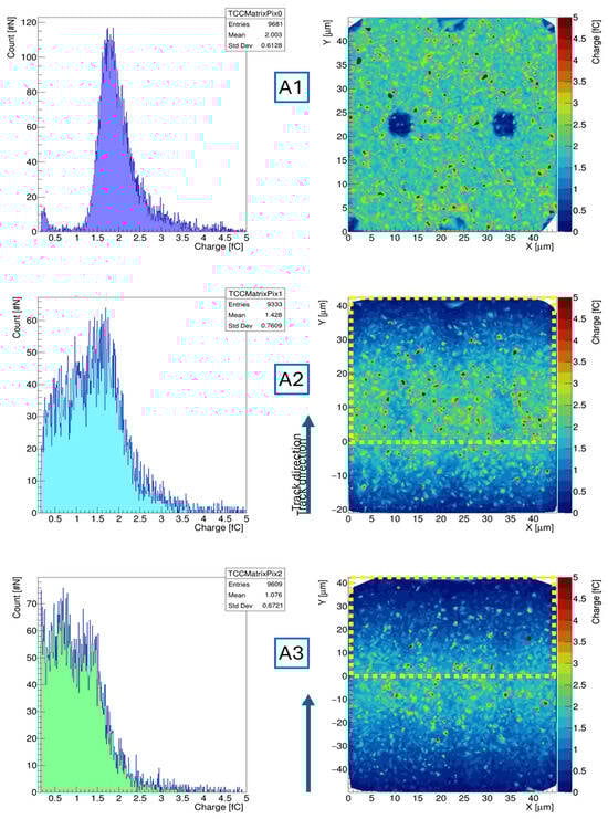 From the tilted maps, it is possible to see the effects of the GEANT4 simulation performed in Figure 7. The maps and corresponding charge distribution display all events generated within the GEANT4 setup that triggered a signal response above 1000 electron–hole pairs on the simulated pixel (delimited by the yellow perimeter), including not only the events that crossed the main pixel but also all the events that crossed the pixel positioned below.