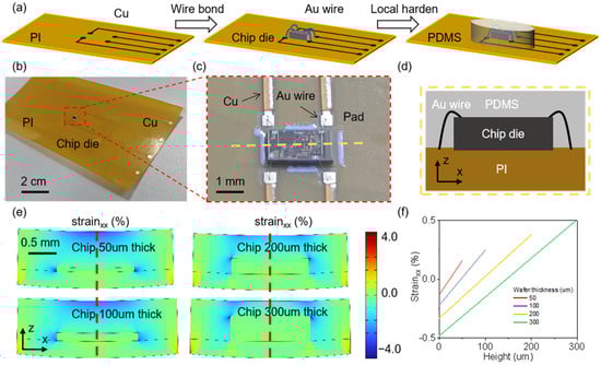 Figure 1d shows a cross-section in the z-axis direction at the yellow dashed line from Figure 1c. Finite element simulation was used to analyze the solid mechanics of this cross-section, with results displayed in Figure 1e,f. Figure 1e shows the strain distribution in the xx direction at a bending radius of 10 mm, while Figure 1f shows the xx direction strain distribution inside the chip die at the red dashed line in Figure 1e. The thinner the chip die, the smaller the strain it experiences, and the presence of PDMS effectively ensures that the xx direction strain at the bonding point between the gold wire and the chip die pad remains below 4%. However, due to lower yield rates for chip die thicknesses of 150 μm or less, this study chooses a thickness of 200 μm for the chip die.
