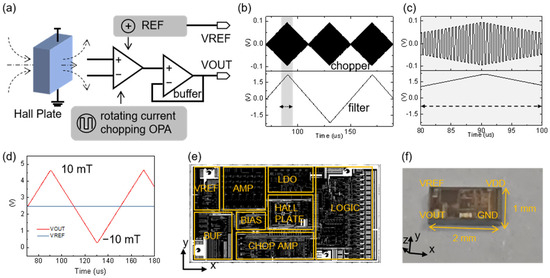 The framework of the Hall ASIC chip die designed in this paper is shown in Figure 3a. The core modules include the Hall plate, reference, logic section, chopper operational amplifier [37,38], demodulation filter, and buffer. This circuit has undergone comprehensive process voltage temperature (PVT) simulation tests, considering different operational states such as slow and fast power-on, over-voltage, over-current, and electrostatic discharge (ESD). It can provide magnetic sensing performance with sensitivity fluctuations of less than 3% over the temperature range of −40 to 125 °C. For confidentiality reasons, further details of the circuit structure are not provided here. The behavioral simulation of the Hall plate is specified using a Verilog-A model, allowing for the simulation of arbitrary input magnitudes of z-direction magnetic induction strength ().