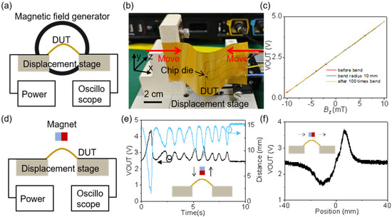 Figure 4d shows the experimental setup for measuring the magnetic field response using a permanent magnet. As illustrated in Figure 4e, the output VOUT varies as the position of the permanent magnet changes relative to the flexible magnetic field sensor. However, since the direction of the magnetic field remains unchanged, the output values are all above 2.5 V.