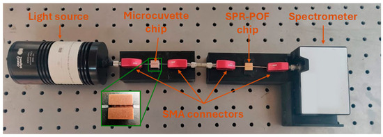 During the measurements carried out with the microcuvette-based chip, the SPR-POF platform was located between the sensing POF microcuvette chip and the spectrometer, as described in [23]. A picture of the experimental setup is reported in Figure 1. It consisted of a white light source (HL2000-LL, Ocean Insight, Orlando, FL, USA) illuminating the POF-based sensitive patch with micro holes, where the antibody–cytokine binding takes place into the microcuvette. The latter chip was used to launch the light into the SPR-POF probe with the SPR surface in contact with a fixed solution with a suitable refractive index (RI = 1.332, i.e., water) used to trigger the SPR phenomena. The light transmitted by the plasmonic platform was then collected by a spectrometer (FLAME-S-VIS-NIR-ES, Ocean Insight, Orlando, FL, USA), which was connected to a laptop to acquire and process the experimental data. The setup implemented a measuring scheme that harnessed the SPR technique in a way that is different from the classical methodology. The sensor system did not exploit the refractive index variation due to the receptor–analyte interactions at the plasmonic surface, but it exploited the characteristics of the multimode waveguides (in this case, the modified POFs) that can be used to achieve a variation of the incident angles of the propagated light under the other D-shaped POF chip with an SPR surface as a consequence of the receptor–analyte interactions in the core of the D-shaped POF with the micro holes, causing a shift in the resonance wavelength [23]. The device presented two D-shaped POF chips (microcuvette and SPR chips) connected via SMA connectors; so, starting from the primary exciting light source, there were different changes in the propagated modes, i.e., an intra-POF (from a circular POF to a D-shaped POF and from the D-shaped POF to a circular POF) considering the first chip. Then, the latter acted as the exciting source connected to the second chip via a free-space propagation region (the metal tube screwed to the SMA connectors). This means that the light impinges on the input fiber of the second chip (the plasmonic one) with a modal configuration that depends on the status of the first chip.