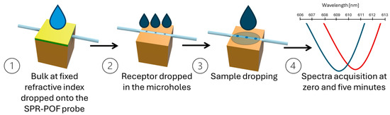 For all the interleukin–antibody interactions, the measurements were carried out according to the measurement protocol reported by Cennamo et al. [23] and outlined in Figure 2. To summarize, at first, the reference spectrum was acquired by considering air in contact with the SPR surface (in this case, the SPR condition was not satisfied) and the micro holes in the sensing patch filled with PBS (the matrix in which the binding was investigated). The SPR condition was satisfied by dropping 50 μL of the selected dielectric (water; RI = 1.332) over the plasmonic surface of the SPR-POF probe (the gold nanofilm). The SPR spectra were obtained by normalizing the acquired transmitted spectra during the time to the reference spectrum.