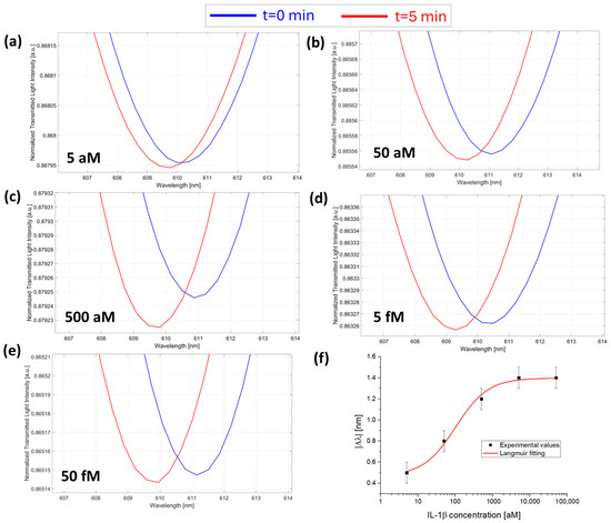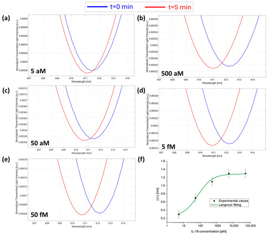 Finally, the sensor device response was investigated for the concentration monitoring of IL-18 protein, maintaining, as previously explained, a fixed concentration of anti-IL-18 antibody (7.3 fM) inside the micro holes of the microcuvette chip and dropping different concentrations of IL-18 ranging from 5 aM to 50 fM over the chip. Figure 5a–e reports the SPR spectra during time at different concentrations of IL-18. Also, in this test, |Δλc| values registered over time and calculated as described above were plotted as a function of IL-18 concentrations and fitted with the Langmuir model equation (Equation (1)), as shown in Figure 5f, with the fitting parameters listed in Table 1.