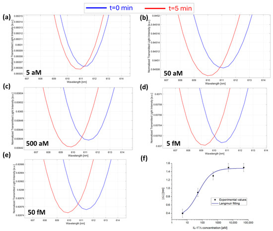 SPR spectra collected at zero (blue line) and five minutes (red line) of incubation time and obtained at different IL-17A concentrations: (a) 5 aM; (b) 50 aM; (c) 500 aM; (d) 5 fM; and (e) 50 fM with the micro holes filled with a solution at a fixed concentration of anti-IL-17A (7.3 fM) in PBS. (f) Absolute values of resonance wavelength variations (|Δλ|) at five minutes with respect to zero minutes as a function of the IL-17A concentration in a semi-log scale and Langmuir fitting of the experimental values. Mean values are out of n = 3, and error bars refer to the maximal measured standard deviation.