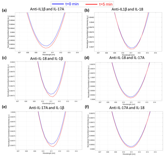 Selectivity tests. SPR spectra during time collected at zero (blue line) and five minutes (red line) of incubation time and obtained in the presence of the “wrong” anti-interleukin antibody–interleukin: (a) anti-IL-1β/IL-17A; (b) anti-IL-1β/IL-18; (c) anti-IL-18/IL-1β; (d) anti-IL-18/IL-17A; (e) anti-IL-17A/IL-1β; and (f) anti-IL-17A/IL-18.