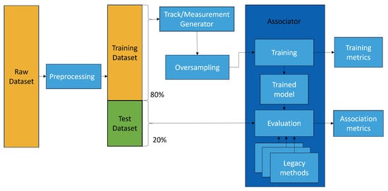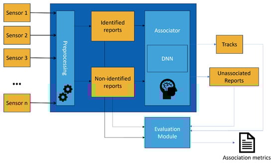 The main steps of the process are Preprocessing, Association, and Evaluation. In the Preprocessing stage, data are conditioned, and the positions reported by the sensors are projected on a common Cartesian reference plane, as each sensor uses a different coordinate system. Then, the reports are split depending on whether a target address identifies them or not and fed into the Associator that chains the reports into tracks. Lastly, the Evaluation process computes the performance metrics of the association system.