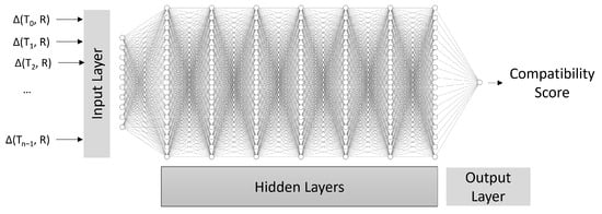 In our case, the DNN is trained to predict the between a track and a report, that is, if they belong to the same originating target. This removes the need for expertly tuned target dynamic models and sensor noise profiles for data association. To predict the compatibility, the model uses the difference between the last n measurements in a track and the current report, as defined in Equation (8), and outputs a value in the range that represents the model’s confidence in the compatibility between the report and the track. To avoid confusion with other variables, the measurement is renamed as R.