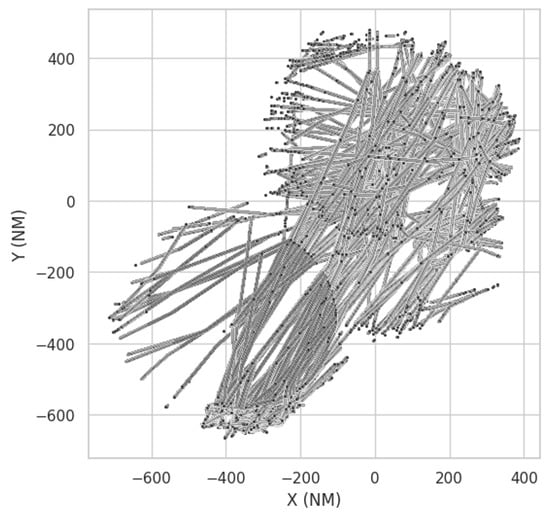 OpenSky is an aggregator of crowd-sourced air traffic control data received through a volunteer network of ADS-B antennas spread across the globe, with high coverage over Europe and North America [45]. They provide datasets for use in scientific publications. The dataset used in this paper is one of the weekly 24 h data, namely the 2022-06-27 dataset (https://opensky-network.org/datasets/states/2022-06-27/ (accessed on 19 October 2023)).