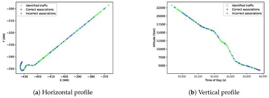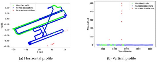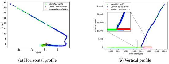 Horizontal (a) and vertical (b) profile of take-off track with identified reports in green, non-identified reports in blue, and incorrectly associated reports in red.