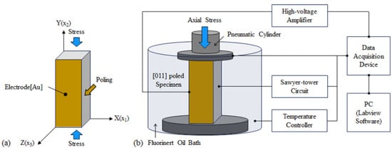 Set-ups for field-dependent test of [011] poled PIN-PMN-PT and [011] poled Mn:PIN-PMN-PT single crystals: (a) Schematic drawing of the test specimen and (b) stress-dependent electro-mechanical characterization system.