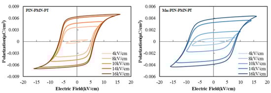 Figure 2 presents the polarization–electric field with respect to the different driving electric fields of [011] poled PIN-PMN-PT and [011] poled Mn:PIN-PMN-PT. A compressive stress of 10 MPa and a temperature of 5 °C were applied to the specimens to match the pre-stress and test temperature of the fabricated transducer. The polarization was offset such that the center value was zero. The coercive field (EC), defined as the electric field at which polarization is reversed by the driving electric field, determines the limit of the driving electric field. When the driving electric field is sufficiently smaller than the coercive field, the electric field and polarization exhibit a linear relationship, and hysteresis does not occur. However, when the driving electric field approaches or exceeds the coercive field, significant hysteresis characteristics are observed.