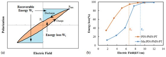 Figure 3a shows a typical P–E curve hysteresis loop of a piezoelectric single crystal, where the inner area of the hysteresis loop represents the energy loss (Wl) and the outer area represents the recoverable energy (Wr) [25,26,27]. The energy loss of single crystals in the hysteresis loop is defined by Equation (1).