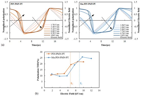 Figure 4 presents (a) the normalized waveform of the polarization with respect to the different driving electric field of [011] poled PIN-PMN-PT and [011] poled Mn:PIN-PMN-PT, and (b) their THD calculated by FFT analysis. When the driving electric field is significantly smaller than the coercive field, the polarization waveform and the driving electric field’s time waveform are linear. However, as the driving electric field increases, nonlinear distortion appears in the polarization waveform over time, as indicated by the black arrows in the figures. The THD of the polarization waveform under a small driving electric field is approximately 12%, which is the general THD value of the triangular wave [30,31]. However, the THD increases under a high driving electric field, exceeding 20% when the driving electric field is above the coercive field. [011] poled Mn:PIN-PMN-PT single crystals with a higher coercive field exhibit a lower THD than [011] poled PIN-PMN-PT under the same driving electric field. As the THD of a piezoelectric single crystal directly relates to the transducer’s distortion of the driving current and the generated sound wave, the THD of the transducers under high-power driving needs to be investigated for the verification of the high-power characteristics of single-crystal transducers.