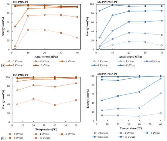 Energy loss as a function of the driving electric field with axial-stress changes (a) and temperature changes (b) for [011] poled PIN-PMN-PT and [011] poled Mn:PIN-PMN-PT.