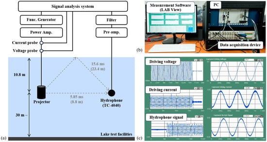 Underwater acoustic characteristic tests of the transducers were performed in Lake test facilities. Figure 7a shows a schematic diagram of the measurement setup. The fabricated relaxor-PT crystal transducer and a standard hydro-phone (TC4040, Teledyne Reson, Slangerup, Denmark) were installed at a water depth of 10.8 m with a distance of 8.8 m to minimize interference from surface-reflected waves. The water temperature at the installation depth was measured to be approximately 5 °C. The driving signal generated by a function generator (33500B, Agilent Technologies Inc., Santa Clara, CA, USA) was amplified using a high-voltage amplifier (L20, Instrument Inc., San Diego, CA, USA) and applied to the transducer to emit sound waves. The acoustic signal measured by a standard hydrophone was amplified, filtered, and acquired by a signal analysis system. As shown in Figure 7b, the signal analysis system comprises a data acquisition device, a PC, and measurement LabVIEW 2020. The waveforms of the driving voltage signal, current signal, and hydrophone receiving signal are shown in Figure 7c.