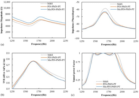 Figure 8 presents the measured results (solid lines) and FEM analysis results (dotted lines) of the impedance, TVR, and power factor of the fabricated [011] poled PIN-PMN-PT and [011] poled Mn:PIN-PMN-PT single-crystal transducers. The measured results were obtained at a driving electric field of 0.4 kV/cm (corresponding to a driving voltage of 100 Vrms). The simulated results were obtained via finite element analysis using the commercial software COMSOL Multiphysics 6.1. For the simulation, the same material properties of [011] poled PIN-PMN-PT and [011] poled Mn:PIN-PMN-PT were applied because the properties of the PIN-PMN-PT and Mn:PIN-PMN-PT facets from iBULe Photonics Inc., Republic of Korea, that were used for the fabrication of the transducers are similar [32,33]. Two fabricated transducers also exhibit similar acoustic characteristics. The measured impedance, TVR, and power factor results showed good agreement with the simulated results, validating the design performance of the fabricated transducers. The resonance frequencies of the fabricated [011] poled PIN-PMN-PT and [011] poled Mn:PIN-PMN-PT single-crystal transducers were identical at 1.56 kHz, with coupling coefficients of 0.50 and 0.49, respectively. The maximum TVR at the resonance frequency for both [011] poled PIN-PMN-PT and [011] poled Mn:PIN-PMN-PT single-crystal transducers was 129 dB, and the −3 dB bandwidths were 258 Hz and 228 Hz, respectively. The power factor of the transducers was tuned to zero, the reactance current at resonance was detected by connecting series inductors, and the half-power bandwidth of the transducers was 626 Hz and 616 Hz, respectively.