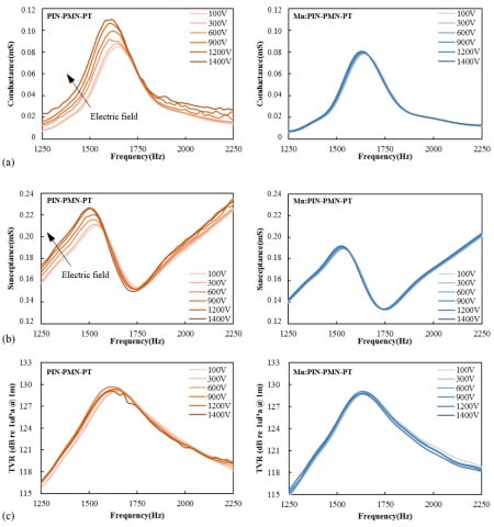Measured conductance curve (a), susceptance curve (b), and transmitting voltage response (c) with respect to the different driving voltage of [011] poled PIN-PMN-PT and [011] poled Mn:PIN-PMN-PT single-crystal transducers.