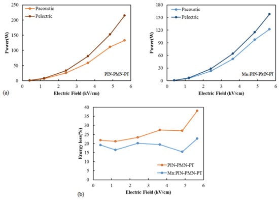 Acoustic and electric power (a) and energy loss (b) as a function of the driving electric field of [011] poled PIN-PMN-PT and [011] poled Mn:PIN-PMN-PT single-crystal transducers.