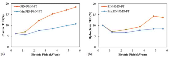 (a) Measured current total harmonic distortion–electric field response and (b) measured hydrophone total harmonic distortion–electric field response of [011] poled PIN-PMN-PT and [011] poled Mn:PIN-PMN-PT single-crystal transducers.