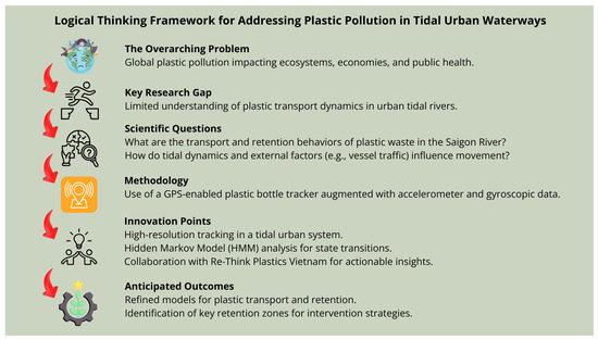 The research not only contributes empirical geospatial data but also proposes innovative approaches to modeling plastic movement under complex environmental conditions. A logical thinking-frame diagram is presented below (see Figure 1). This diagram highlights the overarching problem of plastic pollution, the specific scientific gaps addressed, the methodology adopted, and the anticipated contributions to both science and policy. It serves as a roadmap to guide the reader through the progression of the study.