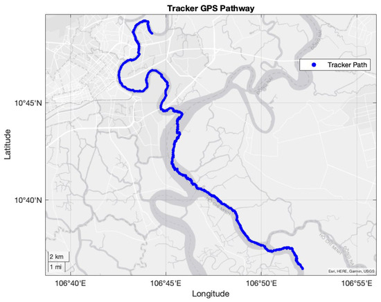 In this study, we designed, fabricated, and deployed a GPS-enabled tracker to understand the movement of a single-use plastic bottle, extending prior research [9,16,21], within the Saigon River’s urban tidal environment. The tracker was developed to capture detailed movement data, including GPS location, speed, and orientation, augmented by gyroscopic, compass, and accelerometer readings. Field deployment involved releasing the tracker into the river system during Vietnam’s Plastic Awareness Month, gathering data across multiple tidal cycles to capture the complex transport dynamics of plastic debris, which provides critical scientific evidence on how plastic waste is transported through urban waterways.