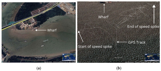 These dynamic forces were likely the result of interaction with external disturbances, such as the wake of a large ship passing through the area. Geospatial analysis of the event pinpointed its occurrence in a busy commercial zone near two large docks, close to the river’s main channel, which can be seen in Figure 8a,b.