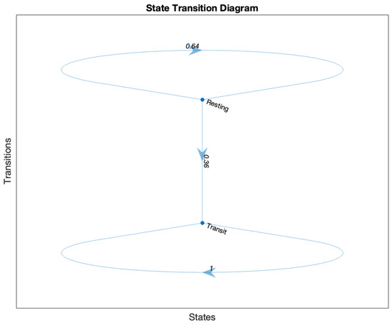 To further understand the transitions between different movement states of the tracker, an HMM was applied. This statistical model was chosen for its ability to analyze sequential data where the system undergoes transitions between unobservable (hidden) states. By modeling stochastic processes, the HMM captures the probabilistic nature of these transitions, making it particularly suited for telemetry data where patterns in movement are influenced by complex and often indirect environmental factors, such as tides, currents, and physical obstructions. The analysis revealed two distinct states: “resting” and “transit”. The matrix, as shown in Table 1, indicated that the tracker had a 64.4% probability of remaining in the resting state once stationary and a 35.6% chance of transitioning from resting to transit. Interestingly, once in the transit state, the probability of remaining in that state was 100%, suggesting that external forces were required to initiate movement but that continuous flow, likely driven by currents and tides, sustained the transit state.