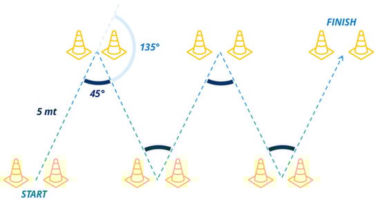 The V-cut test was conducted under two different conditions: without ball (standard V-cut test) and with ball (modified V-cutBk test). This dual approach aimed to evaluate the algorithm’s performance in both general athletic and sport-specific tasks, such as dribbling while handling a ball in order to closely simulate real match conditions. The V-cut test consisted of a 25 m sprint with four CODs (two on the right leg and two on the left leg). Cones were arranged in a “V” shape, ensuring players crossed a marked line at each turn (to anticipate sidestep cutting movements) and requiring an actual COD at a 135° angle with respect to the athlete’s original running direction (corresponding to an internal angle of 45°). Each segment of the run measured 5 m in length (Figure 1).
