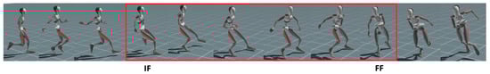 For each identified minimum, a search region was established. Within the search region, transitions between contact and non-contact states in the foot contact columns were analyzed to identify the initial frame (IF) and final frame (FF) (Figure S2). Specifically, the IF was defined as the frame where the foot contact value of the PFC was 1 and its first derivative was also 1. Similarly, the FF was defined as the frame where the foot contact value of the FFC was 0 and its first derivative was 1 (Figure 4).