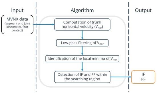 The process begins with MVNX data, including segment and joint kinematics and foot contact information. The trunk’s horizontal velocity (Vhor) is calculated and then low-pass filtered to reduce high-frequency noise. Next, the local minima of Vhor are identified. Around each minimum, a search region is defined to detect the IF and FF based on changes in foot contact. These algorithm-derived IF and FF can then be compared with manually segmented frames. A workflow diagram illustrating the full process, from data acquisition to result validation, is shown in Figure 3.