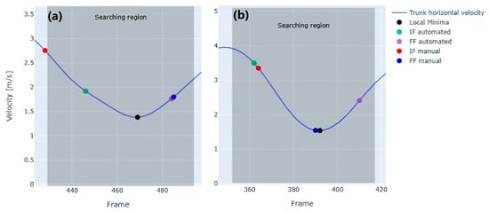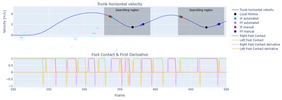 The choice of the local minimum as the reference point can, in certain cases, lead to classification errors. Indeed, an error in detecting the IF is presented, where the manually identified frame falls outside the defined search region (Figure 8a). Another error is observed in identifying the FFC (Figure 8b). In this case, the local minimum detected by the algorithm occurred after the actual FF, and as a result, the algorithm failed to capture the true toe off of the FFC, instead identifying the subsequent one.