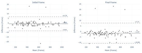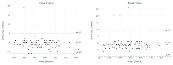 Differences between methods (computed as automatic minus manual segmentation), analyzed across various tests, showed a median difference of 1 frame with an interquartile range (IQR) of approximately 2–3 frames (Table 2).