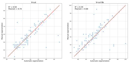 Correlation between manual and automatic segmentation for two conditions: V-cut (left) and V-cut Bk (right). The scatter plots analyze the data of total cutting time (in milliseconds), illustrating the relationship between the two segmentation methods. The coefficient of determination (R2) and Pearson correlation coefficient are reported in each panel. The red lines represent the bisector (y = x).